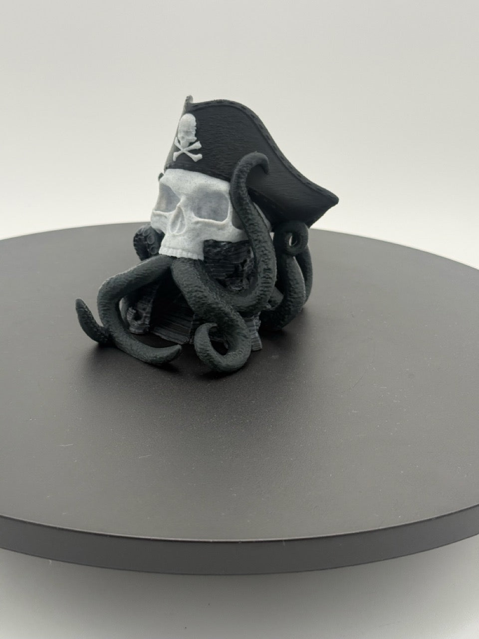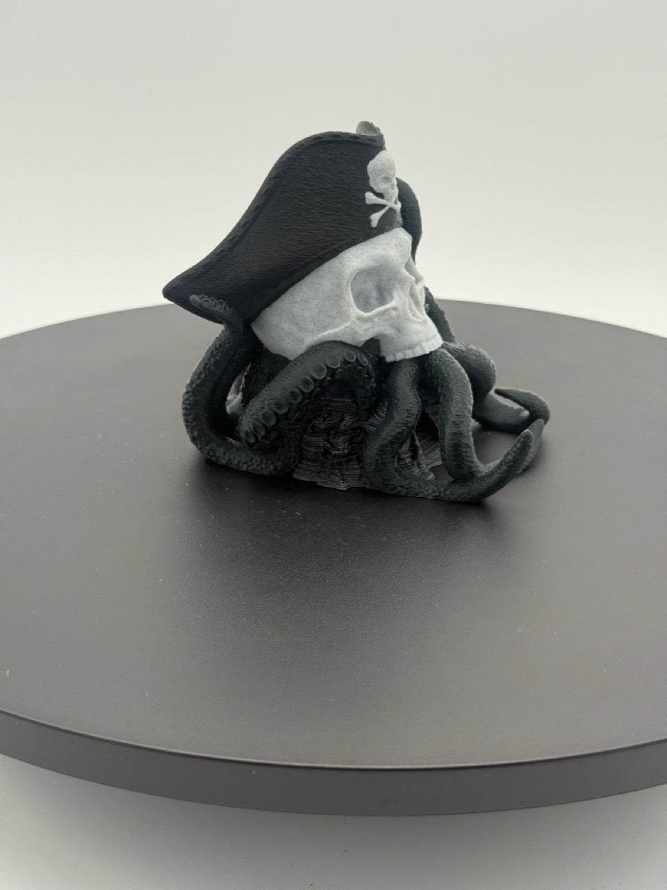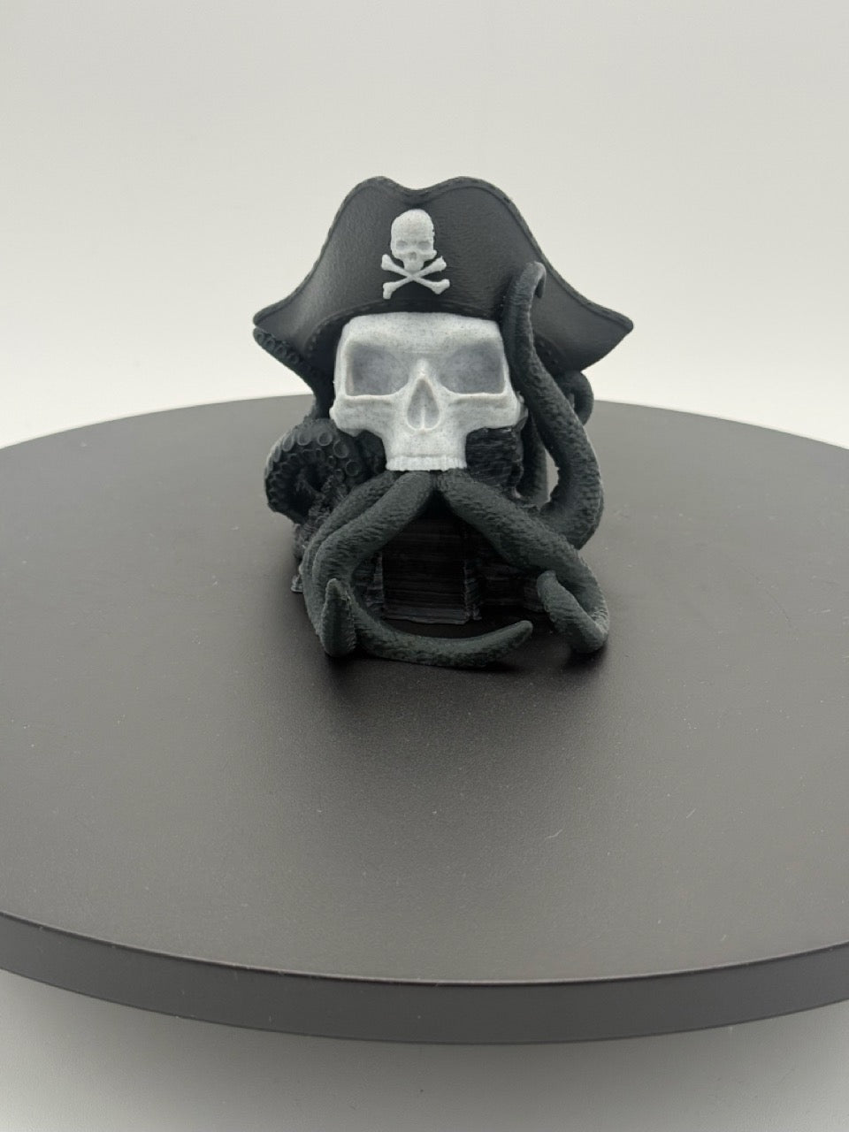 Nautical Horror Design: A ghostly pirate skull, complete with a tricorne hat and a Jolly Roger emblem, is wrapped and supported by a mass of dark, twisting Kraken tentacles. It's the perfect centerpiece for sea-faring adventures and Cthulhu-inspired horror games.