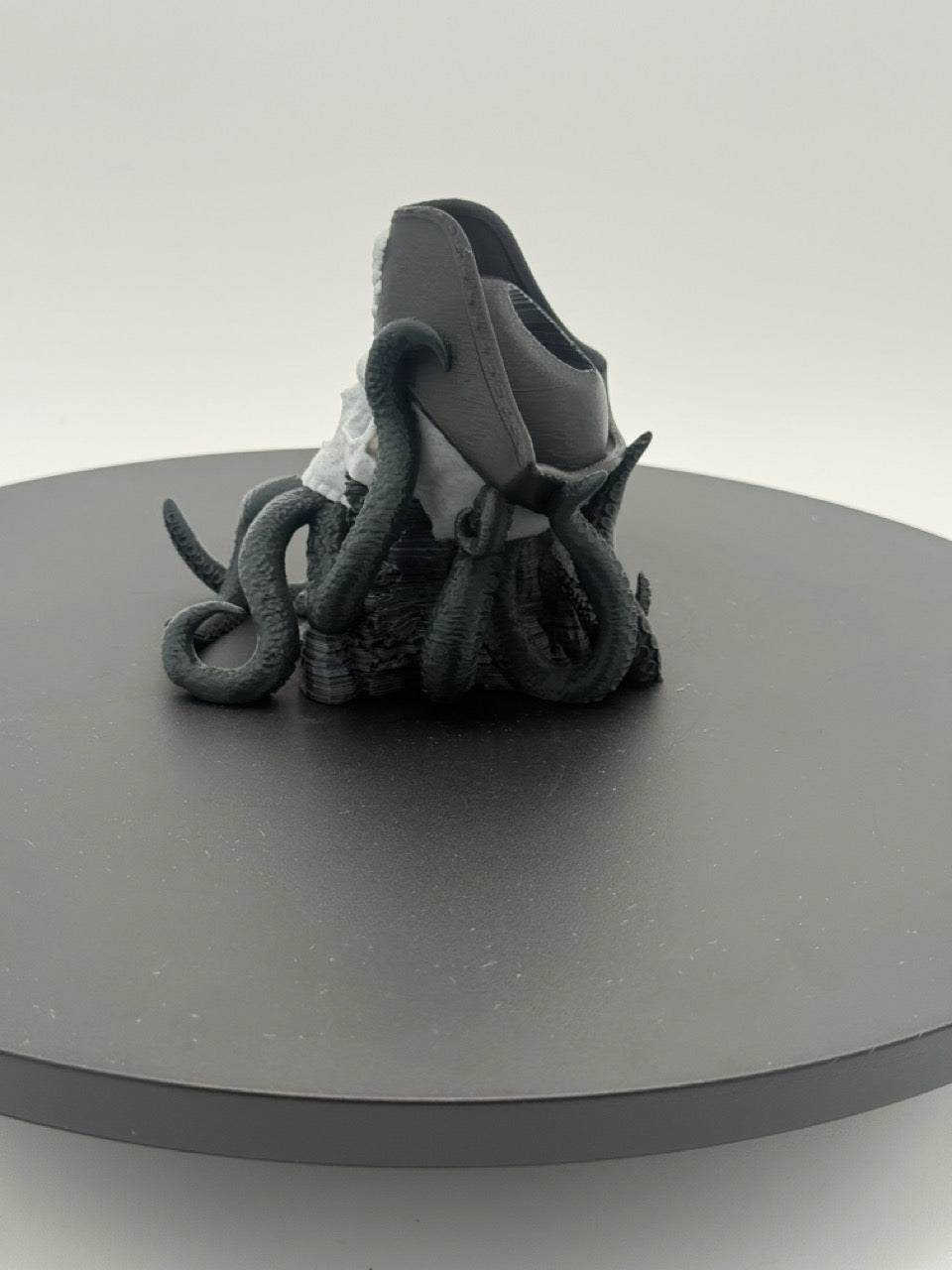Heed the call of the deep with the Captain Kalimar Dice Tower! This unique, 3D-printed accessory brings a touch of swashbuckling dread to your tabletop with its unforgettable fusion of a pirate skull and a menacing Kraken.