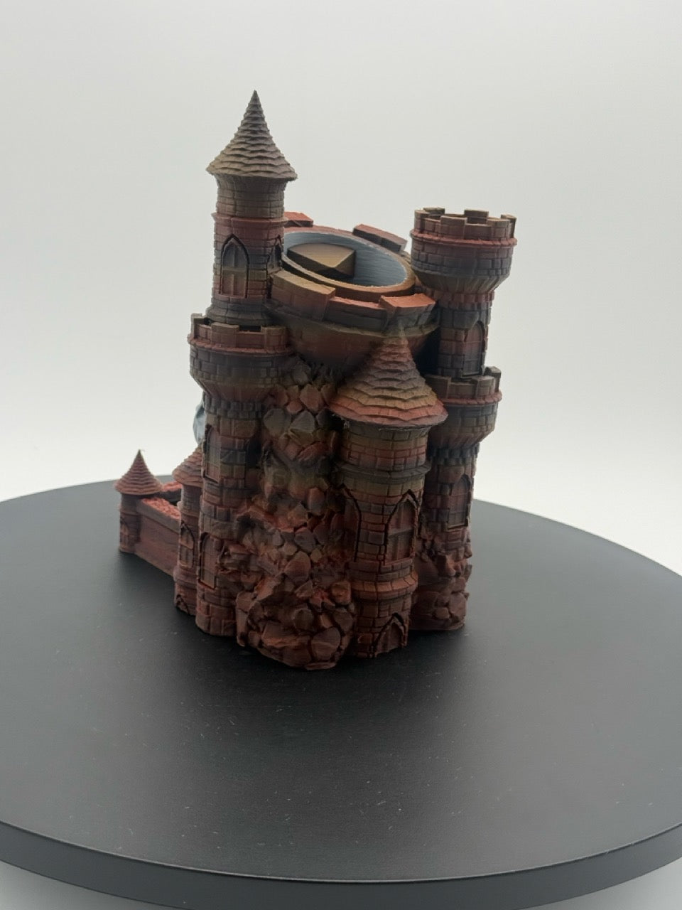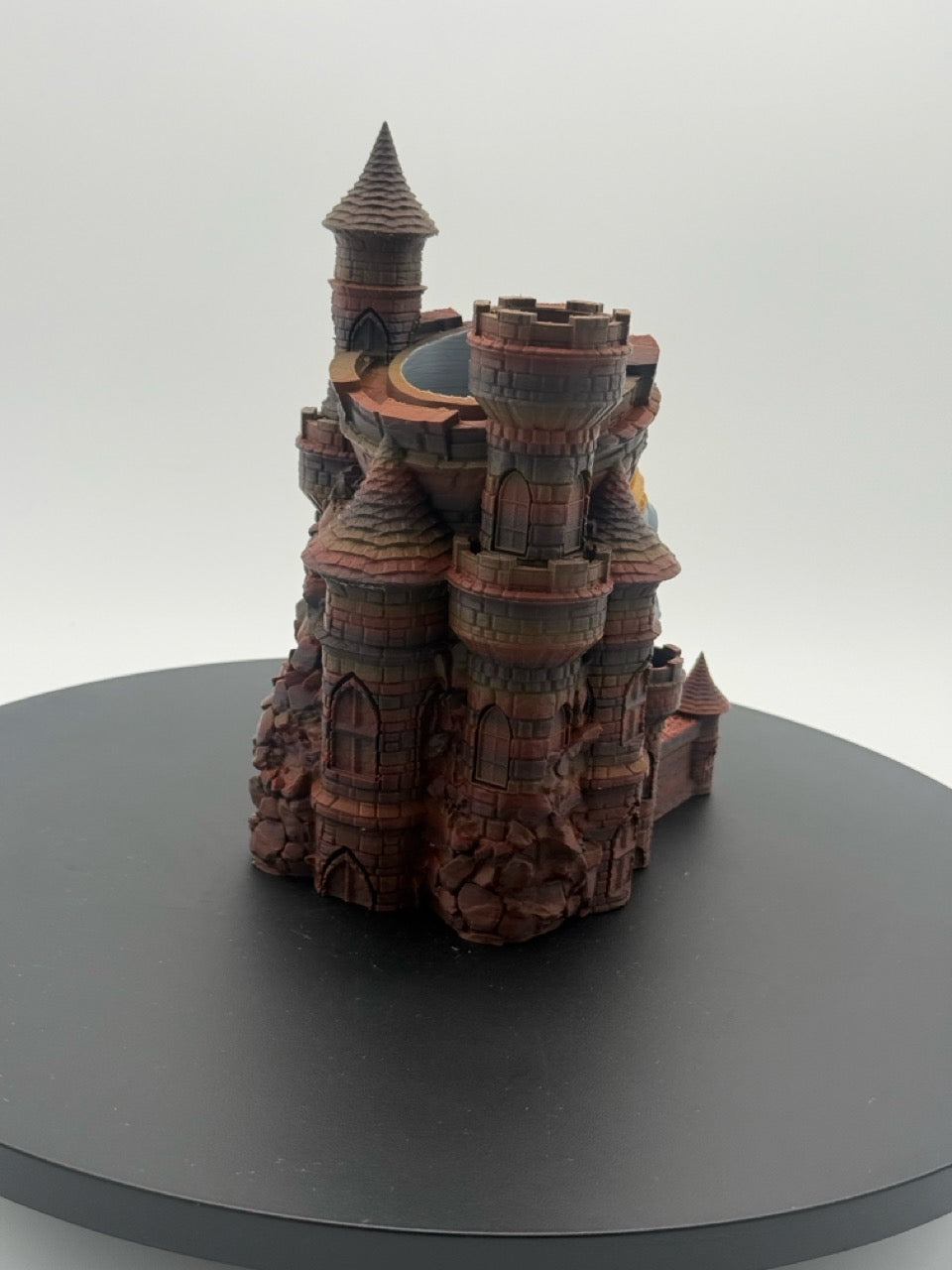Forged in the shadow of a decaying fortress, this tower features intricate castle architecture interwoven with a massive, ominous skull wearing a regal, jewel-studded crown. The striking, multi-color filament design makes it a show-stopping centerpiece for any game night.