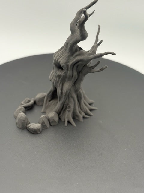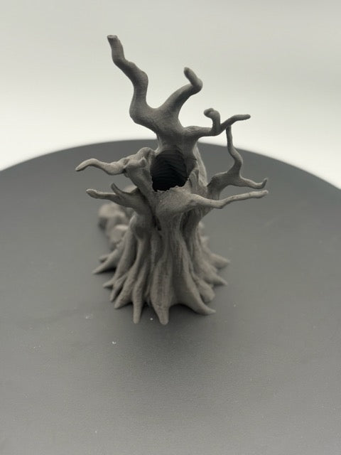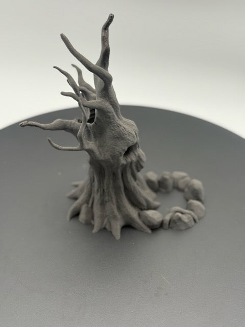 Perfect for any tabletop game, this dice tower features a gnarled, ancient tree with a ghastly, screaming face. Roll your dice through its gaping maw and watch as they tumble down its hollow core, emerging from the tree's roots to land in a circle of ominous stones. The dice tower provides both a thematic element to your game night and a practical way to ensure fair rolls.