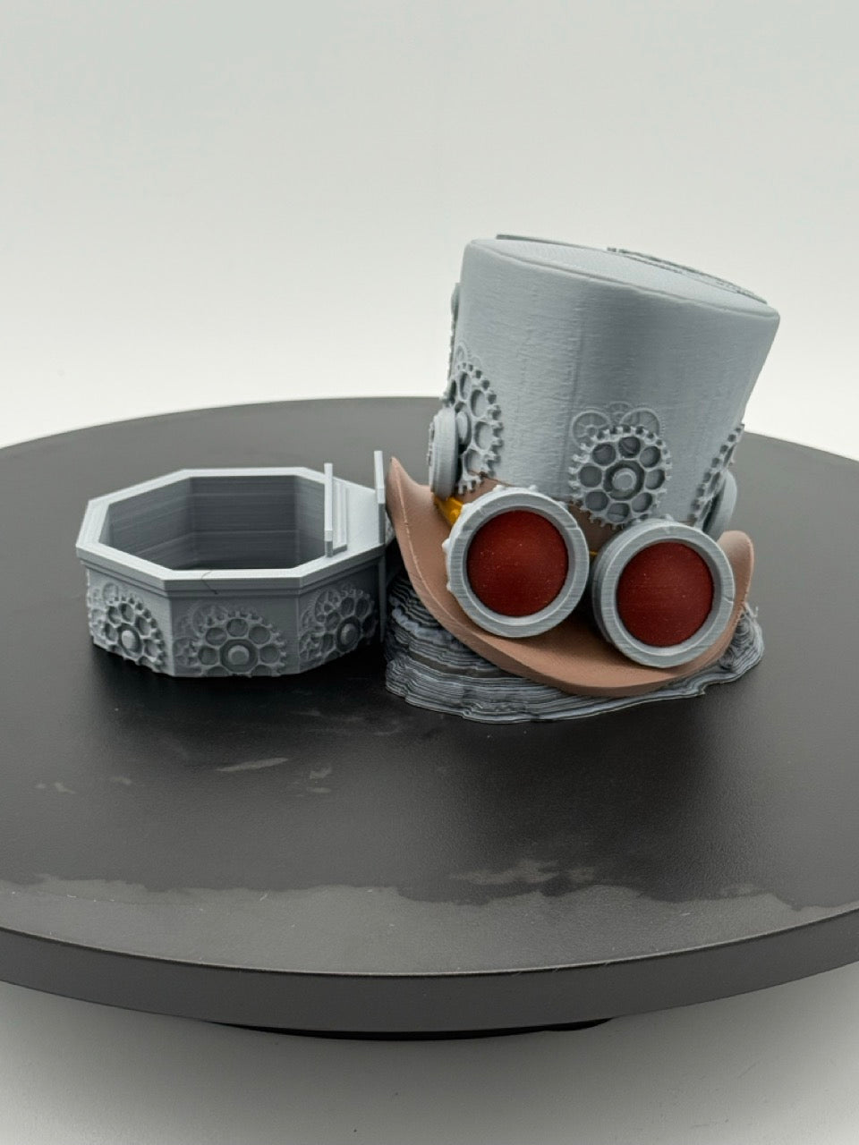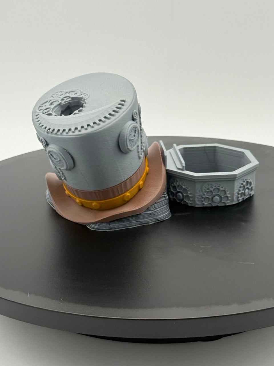 Elevate your game night with a touch of Victorian elegance and mechanical marvel! This exquisitely detailed 3D Printed Steampunk Top Hat Dice Tower is the perfect accessory for adventurers, inventors, and dirigible captains alike.