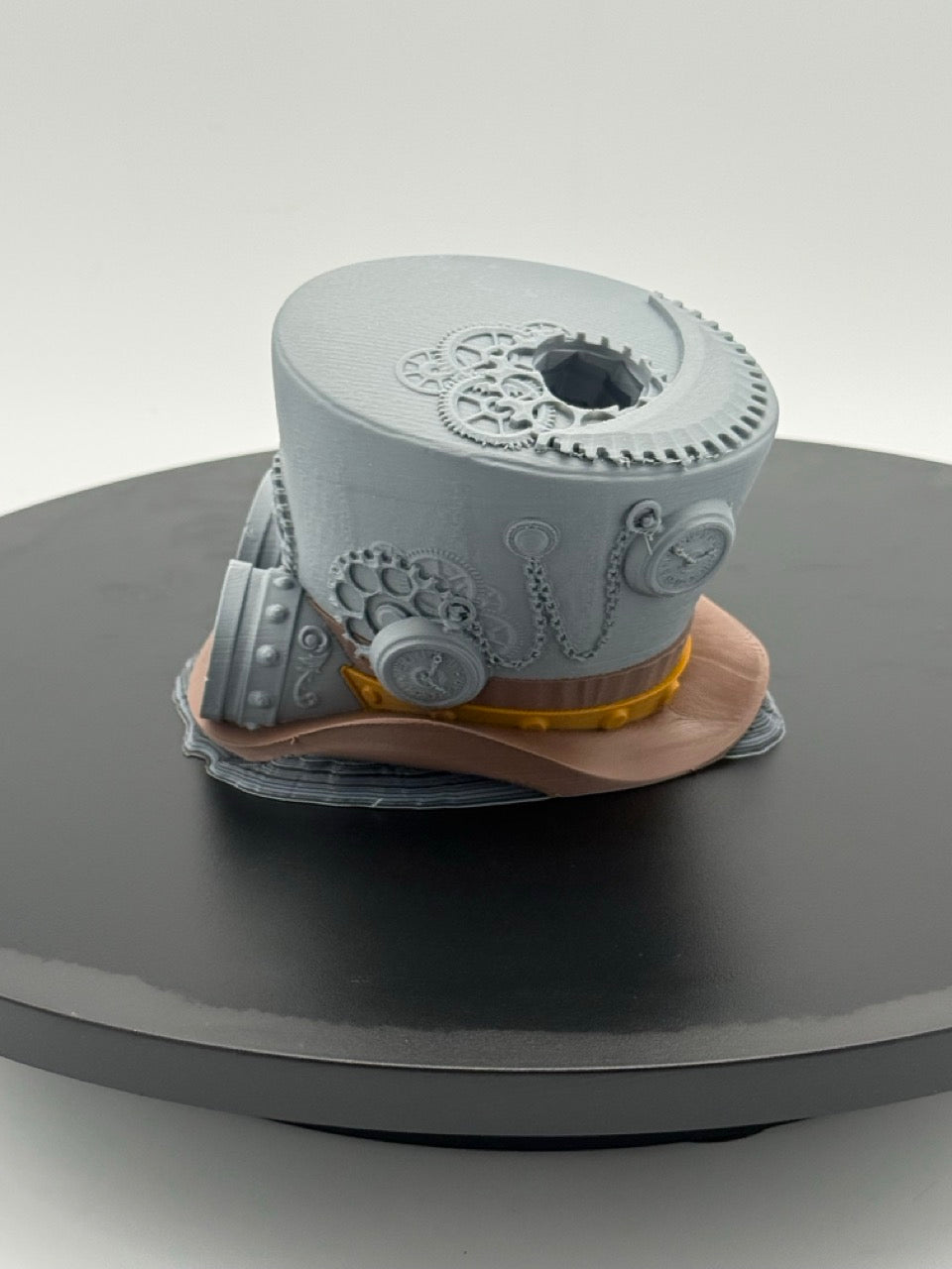 Authentic Multi-Filament Look: Expertly printed with multiple filament colors (e.g., metallic grey for the hat, bronze/brown for the brim, gold for the band, and crimson for the goggle lenses) to give it a rich, finished aesthetic right off the print bed.